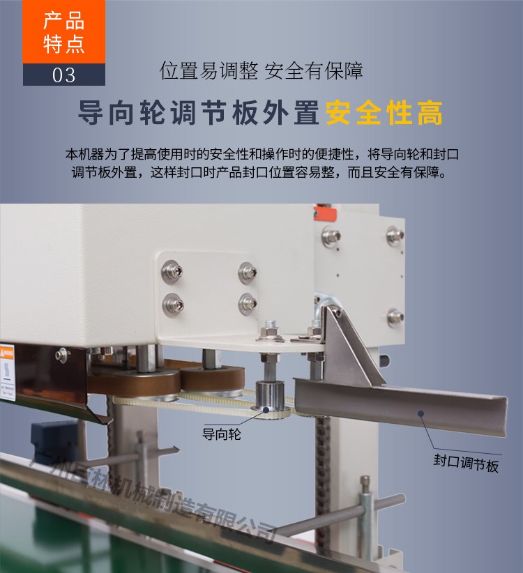 7包裝物進(jìn)入輸送臺(tái)時(shí)必須貼著護(hù)欄,包裝袋口一旦被引導(dǎo)帶拖入后,輸送帶與封口傳動(dòng)同步進(jìn)行封口包裝,此時(shí)請(qǐng)不要對(duì)包裝物任意推動(dòng)或阻擋,以免造成封口效果不良。